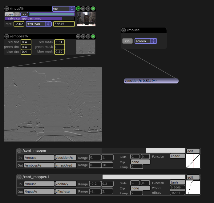 Then we come back and talk about mapping. It’s pretty superficial in this context, but I show how mappings can be set up using Jamoma in Max. First we create a mouse input module to represent our input layer, then we create one or more “continuous mapper” modules to do the mappings, and then start changing those mappings on the fly. It’s really that easy, and everyone was able to grasp what I was talking about immediately when they saw the mouse position controlling the playback rate of a movie and the embossing of that movie. And it was another bit of patching that only took about 30 seconds.