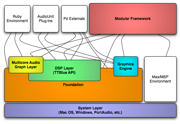 The DSP Layer, now, is actually focused on audio and signal processing. It extends the Foundation’s classes to make it easy to create dynamically bound audio objects. As before, there are example projects in Jamoma that compile into PureData externals and VST/AudioUnit plug-ins, but I’ve now taken the care to add them to the graphic.