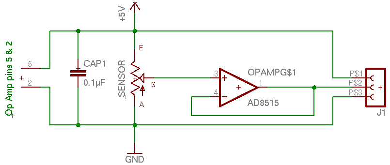 This schematic shows an op-amp (the AD8515 from Analog Devices) wired up as a Voltage Follower. The Sensor is essentially a potentiometer with the outer leads connected to power and ground and the inner tap running into the positive input of the op-amp. You could easily substitute a voltage divider or many other sensors here. The op-amp’s output from pin 1 is connected directly back into the negative input to set it to voltage follower mode, as well as heading out to the Teabox through the center pin on J1 (either a cable or a three pin header). Notice that pins 5 and 2 of the op-amp (somewhat disembodied at the far left of the circuit) are connected to power and ground and are bypassed with the 0.1µF Cap. This is very important as it smooths out fluctuations in the power supply.