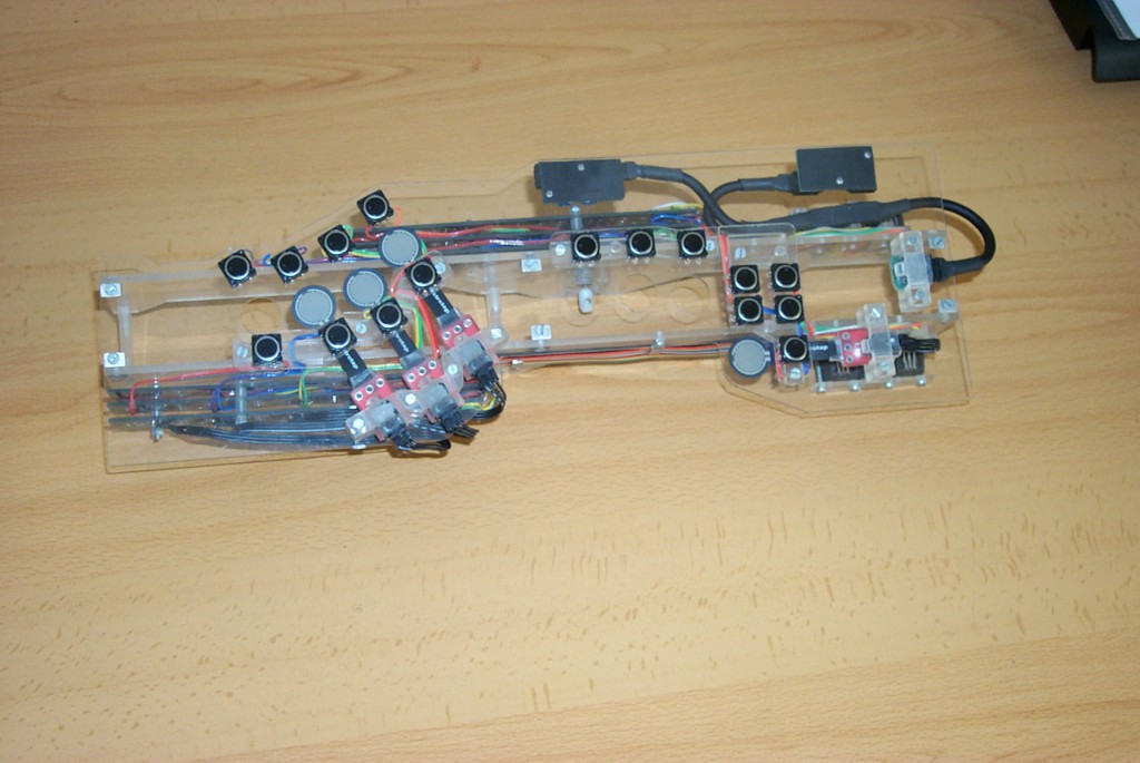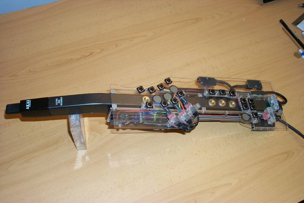 The META-EWI is a modified EWI (Akai’s Electric Wind Instrument) to which was added a whole new set of controllers based on sensor technologies, specifically eight continuous controllers and 16 digital switches. These clearly succeed at stretching the expressiveness and the range of musical gestures found on the original instrument allowing the musician to have a more complete and far reaching control of a great variety of meaningful musical parameters.