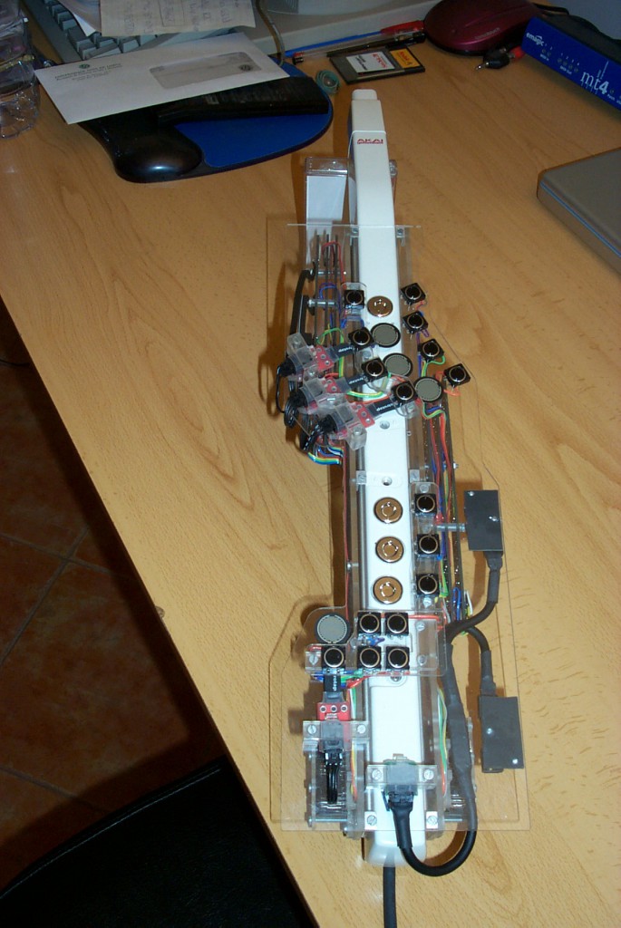 The first modification done on the EWI consisted in rewiring some of its guts in order to turn its Boehm (sax like) fingering into a simpler, horn like, three-valve keying system. This essential alteration not only allows me to play the EWI because I play brass type wind controllers but also and very importantly, it strips off most of the original keys thus allowing all the extra sensors to nicely fit on top of the body of the EWI.